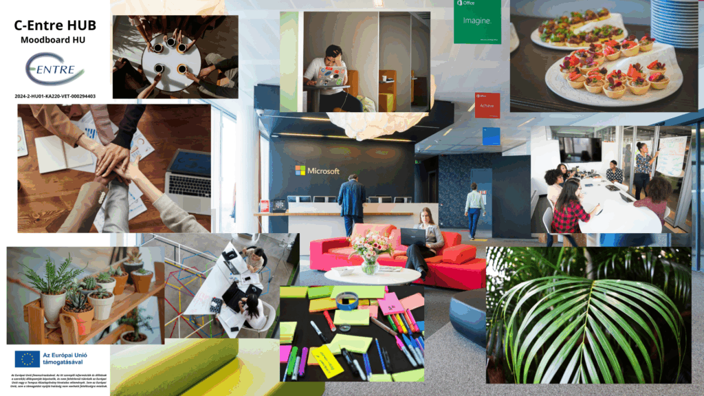 A mi moodboardunk alapja a nyitottság és annak előtérbe helyezése, hogy a vállalkozói sarok hívogató, vonzó legyen mindenki számára, hogy a diákokhoz közel hozzuk a vállalkozások és a vállalkozói lét világát.